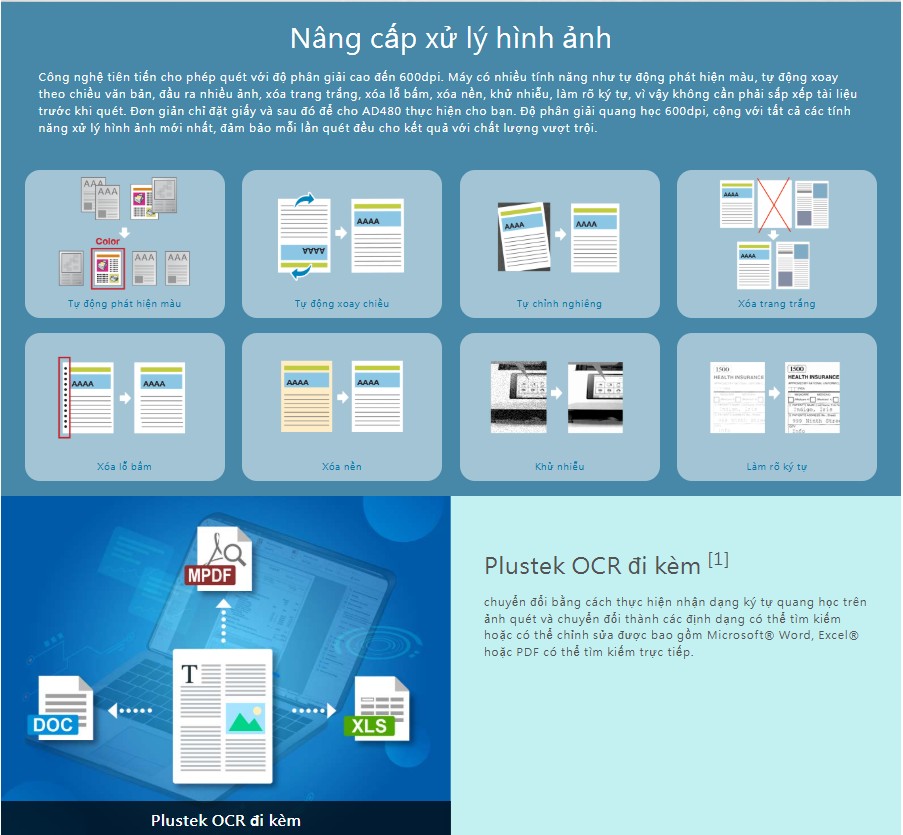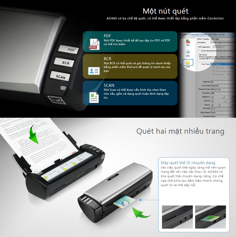 Plustek AD480 là máy quét tài liệu hai mặt tự động, thiết kế nhỏ gọn nhưng mạnh mẽ, phù hợp cho văn phòng, doanh nghiệp nhỏ, phòng giao dịch ngân hàng, trường học và hộ kinh doanh. Với tốc độ quét 20 tờ/phút – 40 ảnh/phút, hỗ trợ khổ giấy từ danh thiếp đến A4, Plustek AD480 mang lại khả năng số hóa tài liệu nhanh chóng, ổn định và tiết kiệm chi phí.