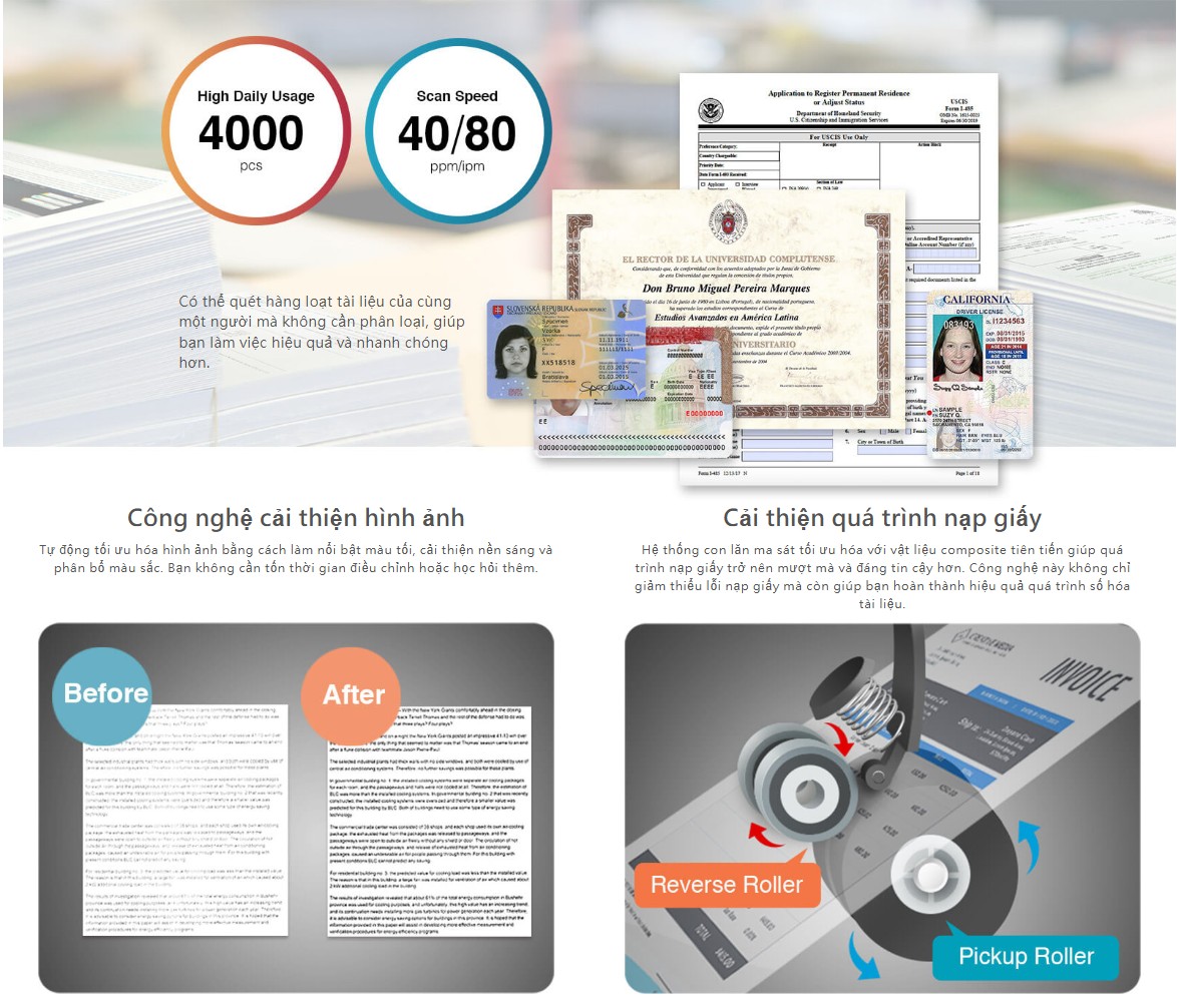 Máy được trang bị công nghệ xử lý hình ảnh tiên tiến, giúp tài liệu quét sắc nét, hỗ trợ OCR tạo PDF có thể tìm kiếm, phục vụ tốt cho lưu trữ và quản lý dữ liệu. PS406U còn hỗ trợ quét thẻ nhựa, giấy dày, hóa đơn và nhiều loại tài liệu đặc thù trong doanh nghiệp.